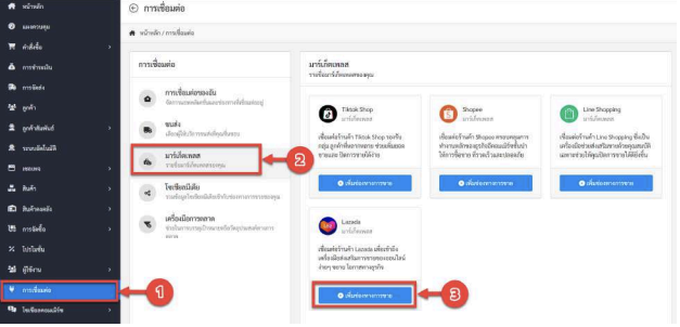 - 3. กดปุ่ม “เพิ่มช่องทางการขาย” บริเวณการเชื่อมต่อของ “Lazada”