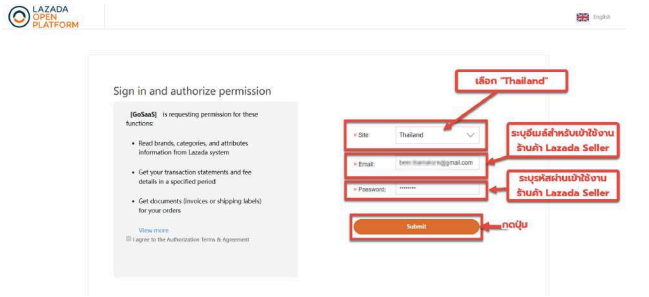 - 6. ผู้ใช้งานทำ การกดปุ่ม “Submit” เพื่ออนญุาตใิห้ระบบ Gosell เชื่อมต่อร้านค้า Lazada ระบบจะทำ การแสดงหน้าจอการ “เชื่อมต่อสำเร็จ” และรอประมาณ 5 วินาทีจะกลับไปหน้าระบบ Gosell