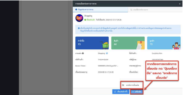 - E. แถบ “ประวัติการทำรายการ” แสดงการทำการเชื่อมต่อช่องทางการขาย หรือการกดเชื่อมต่ออีกครั้ง โดยผู้ใช้งานท่านใดทำรายการ และแสดงวันที่ทำรายการเชื่อมต่อ และวันที่ที่อนุญาติการเชื่อมต่อ