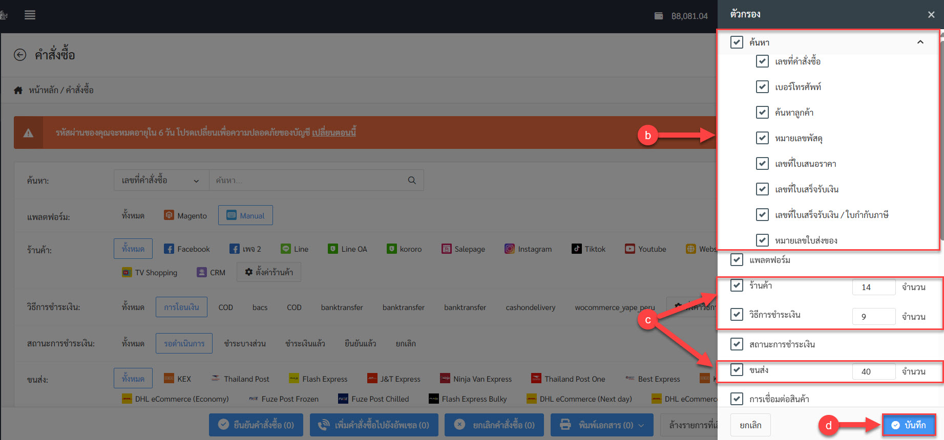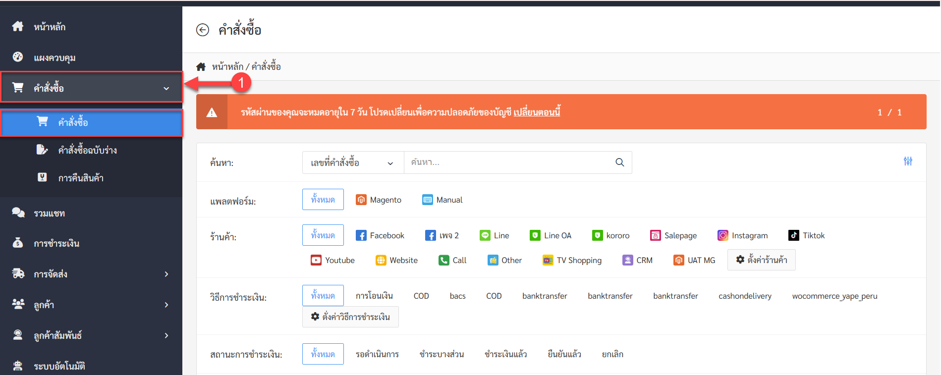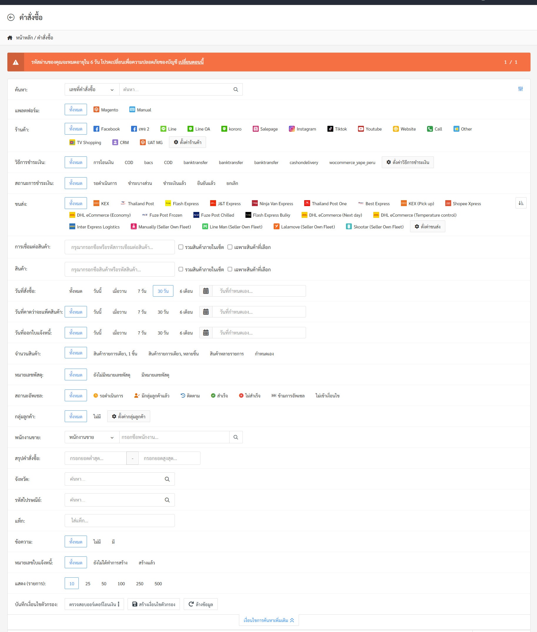 ระบบได้ปรับปรุงหน้าเมนู คำสั่งซื้อ ใหม่ เพื่อให้ครอบคลุมทุกเงื่อนไขการค้นหาและสามารถจัดการข้อมูลทั้งหมดได้ภายในหน้าเดียว เพิ่มความสะดวกและประสิทธิภาพในการใช้งาน