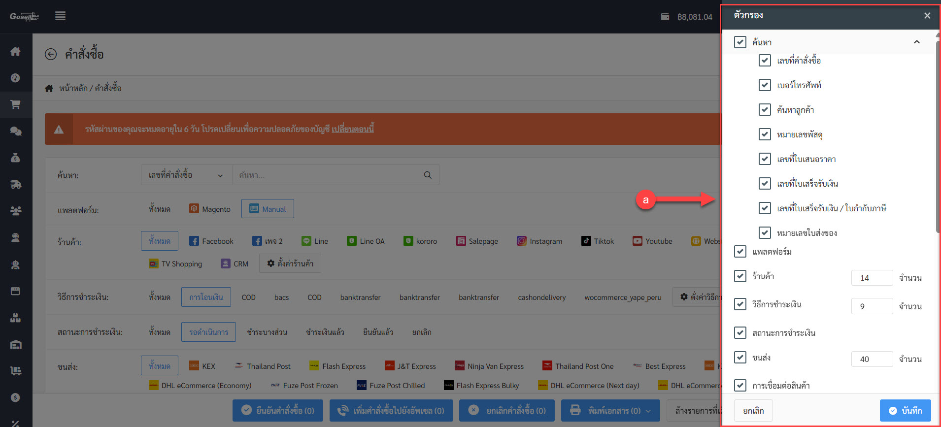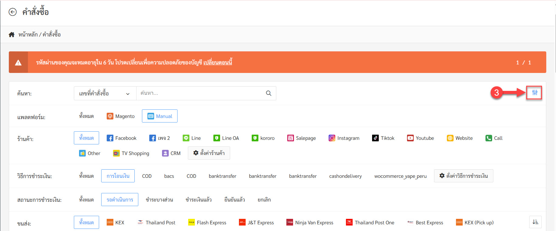 3. สามารถกำหนดการตั้งค่าตัวกรองข้อมูลเพิ่มเติมได้ โดยคลิกที่ปุ่ม ตามภาพ เพื่อเลือกให้ตัวกรอง แสดง/ไม่แสดง ในหน้าเมนูคำสั่งซื้อได้ตามต้องการ