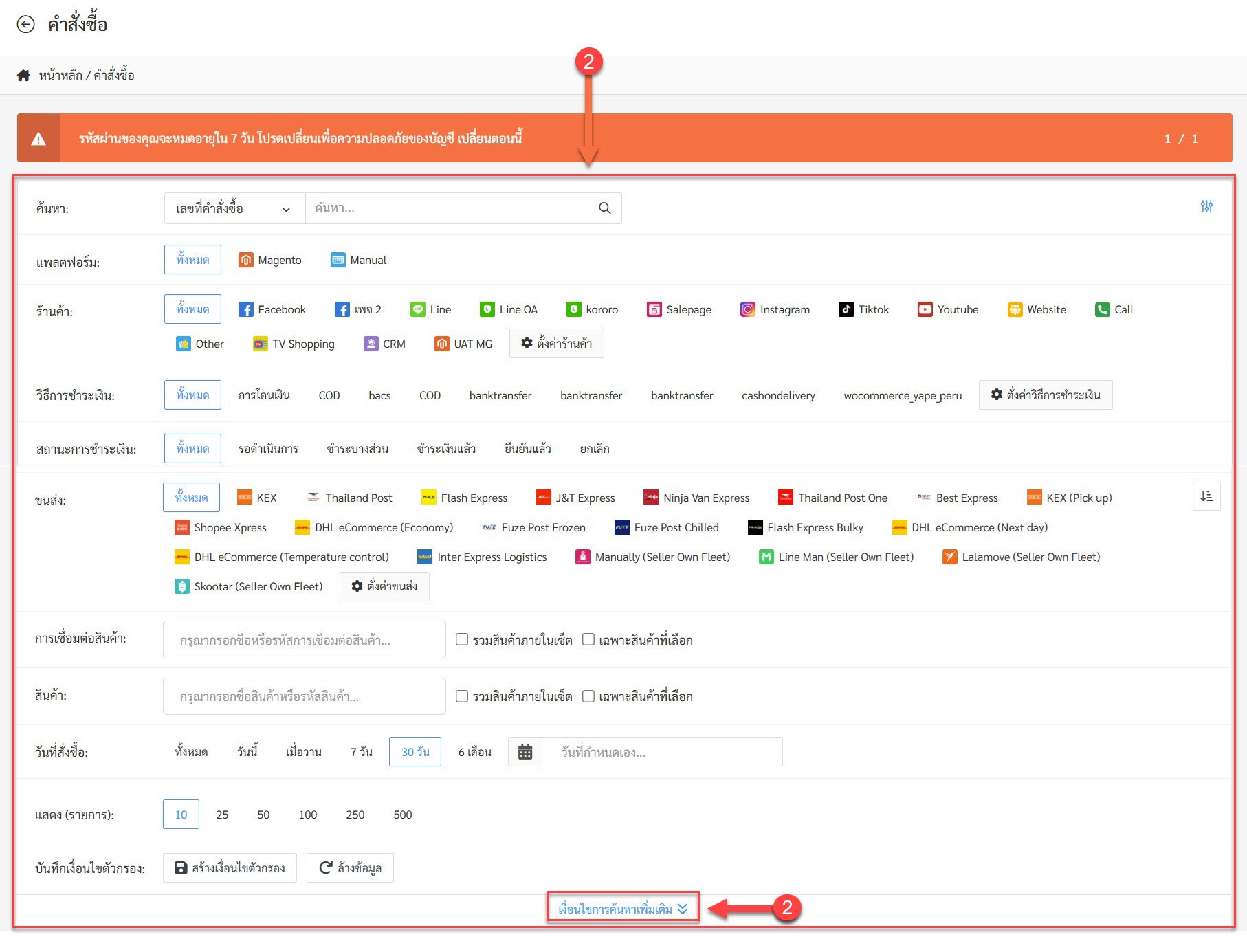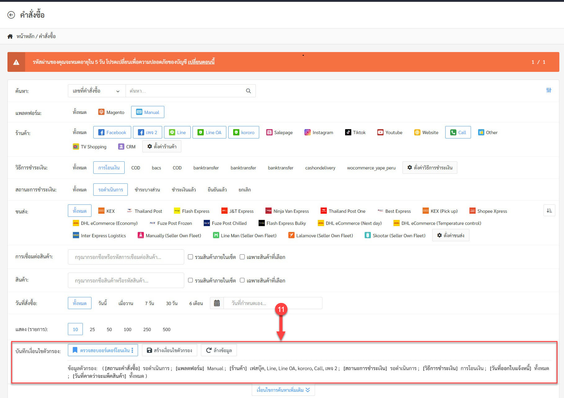 11. ที่เมนูคำสั่งซื้อจะแสดง เงื่อนไขตัวกรอง ที่เลือกเป็นค่าเริ่มต้นขึ้นมาให้