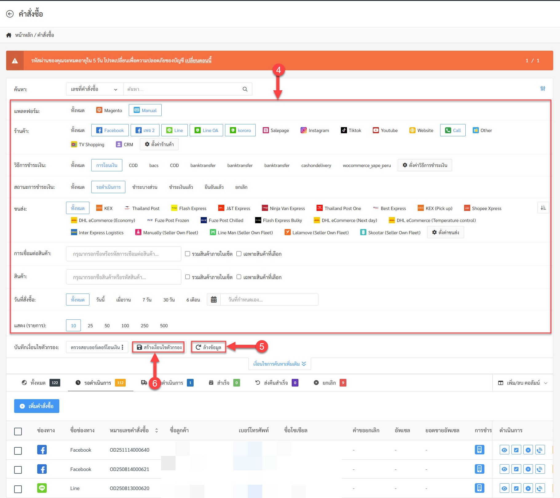 4. สามารถบันทึกตัวกรองข้อมูล ได้ เพื่อบันทึกตัวกรองที่ใช้งานบ่อย ให้คลิกเลือกข้อมูล (หากเลือกไว้จะแสดงเป็นกรอบสีฟ้า) และข้อมูลในหน้าเมนูคำสั่งซื้อจะกรองข้อมูลให้ตามที่กำหนด